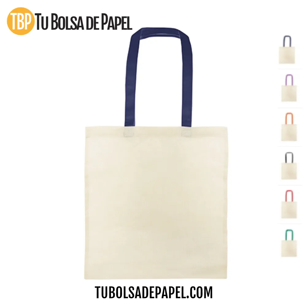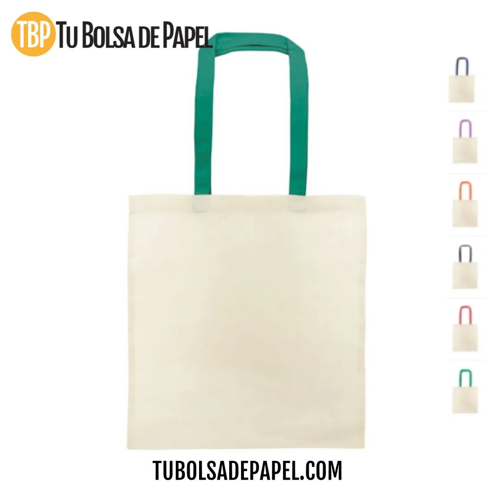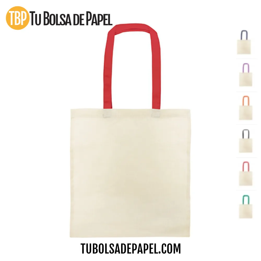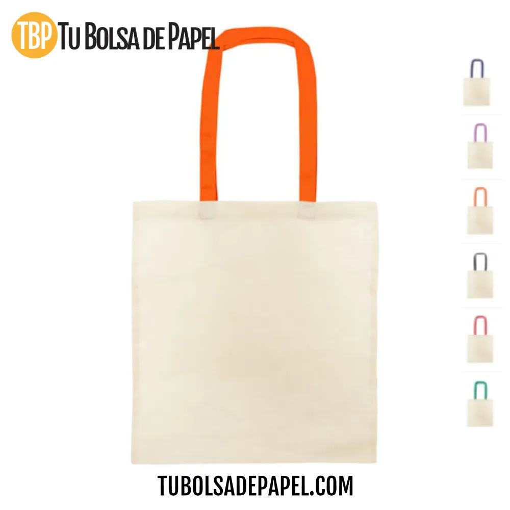 Bolsa de tela de algodón 100% con asas largas en diferentes colores y acabado en color natural. Cómodas para llevarlas al hombro e ideales para combinar el color del asa con tu imagen corporativa.