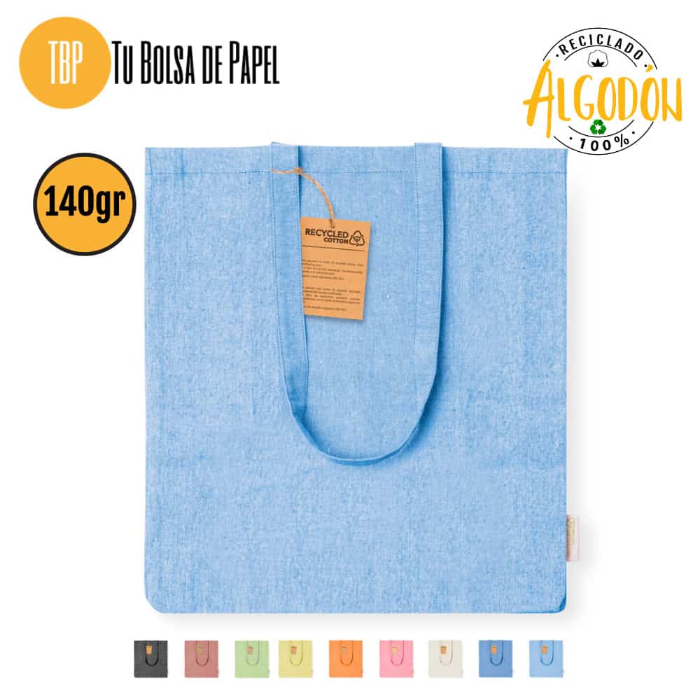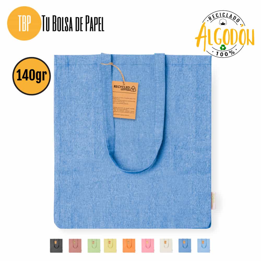 - Algodón 100% Reciclado: Fabricada con materiales de 140 g/m², esta bolsa promueve el reciclaje y el respeto por el medio ambiente.