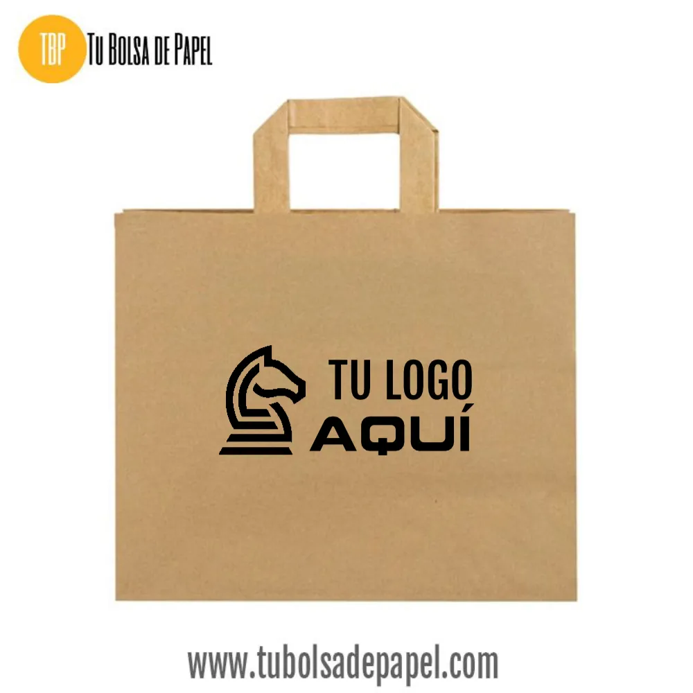 Las bolsas de papel Kraft con el asa plana para comida para llevara se presentan sin personalizar en unidades sueltas, o si las prefieres personalizadas en packs de 500, 1.000, 1.500 y 2.000 unidades, personalizadas a una o dos caras en una tinta mediante Flexografía, por lo que la tinta debe ser más oscura que el papel ( solamente en color, negro, azul marino, rojo y verde.) Para más volúmen pide presupuesto sin compromiso indicando el número de unidades.