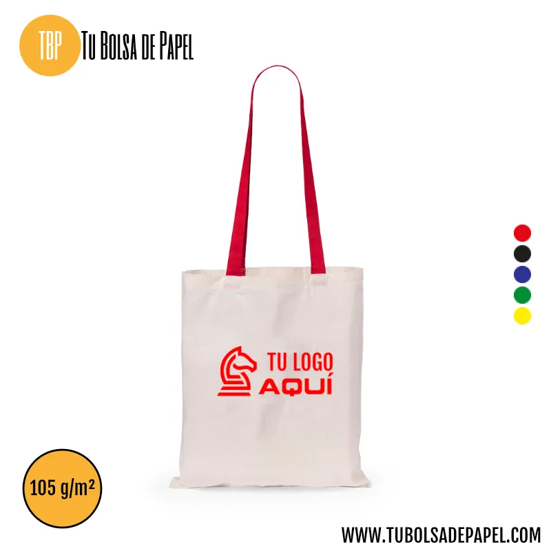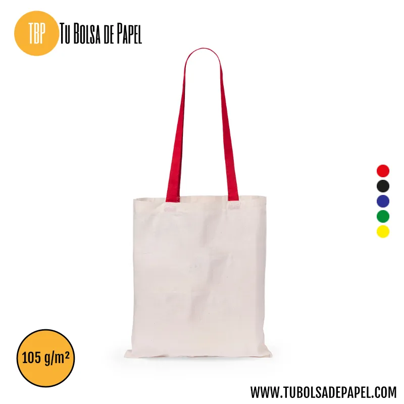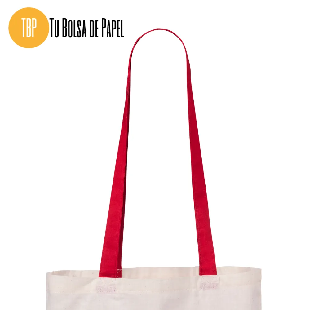 Bolsa de tela de algodón 100% con asas largas en diferentes colores y acabado en color natural. Cómodas para llevarlas al hombro e ideales para combinar el color del asa con tu imagen corporativa.