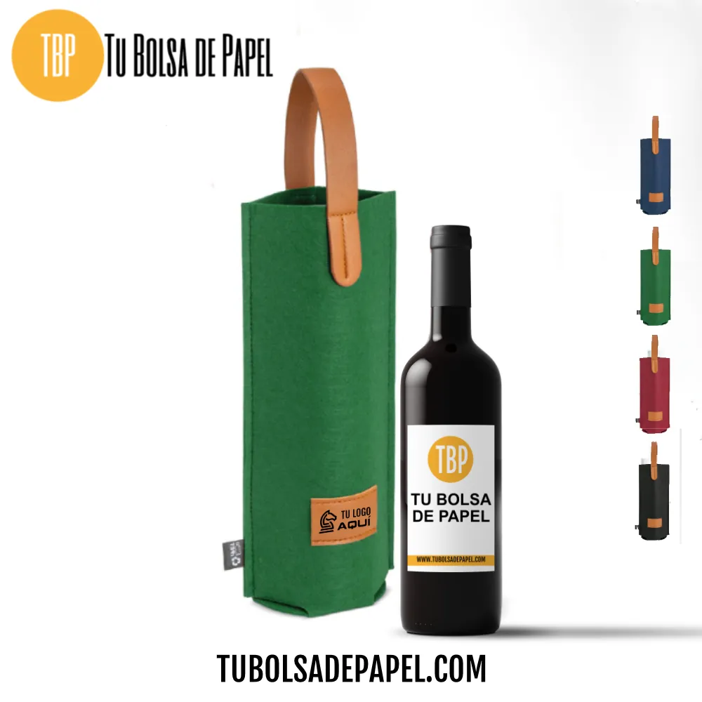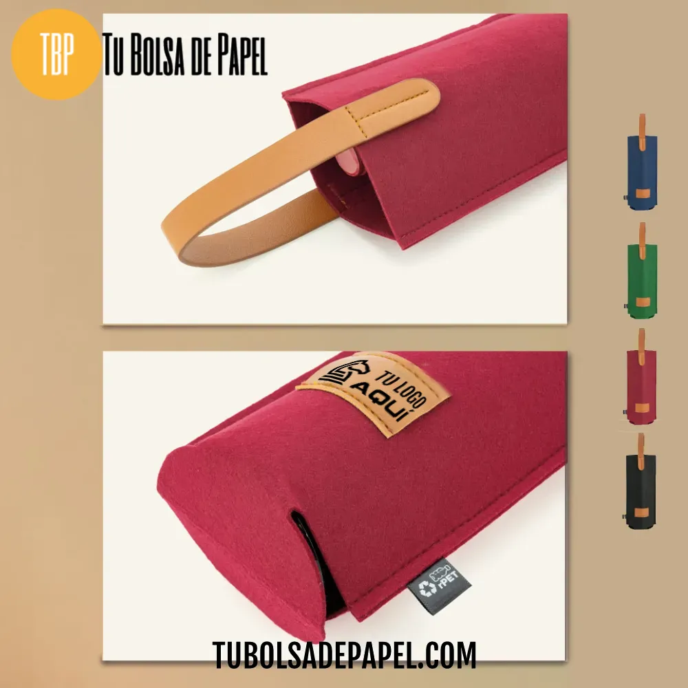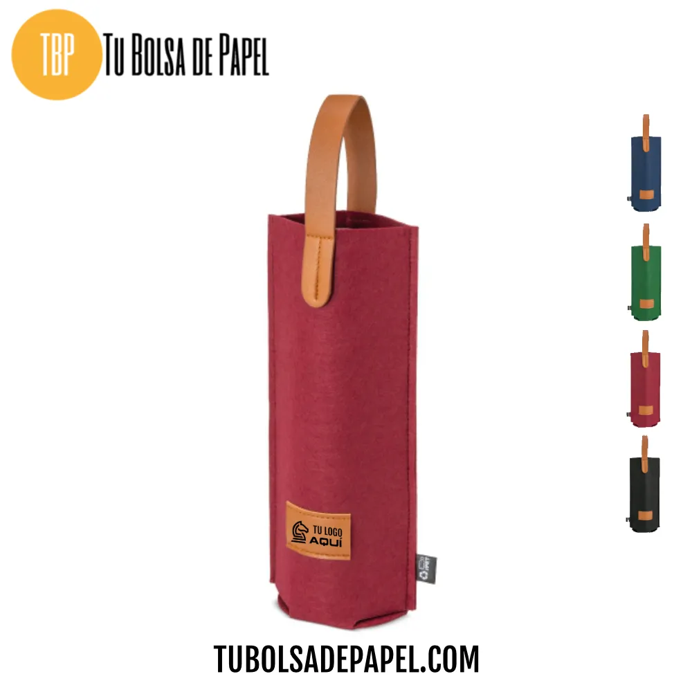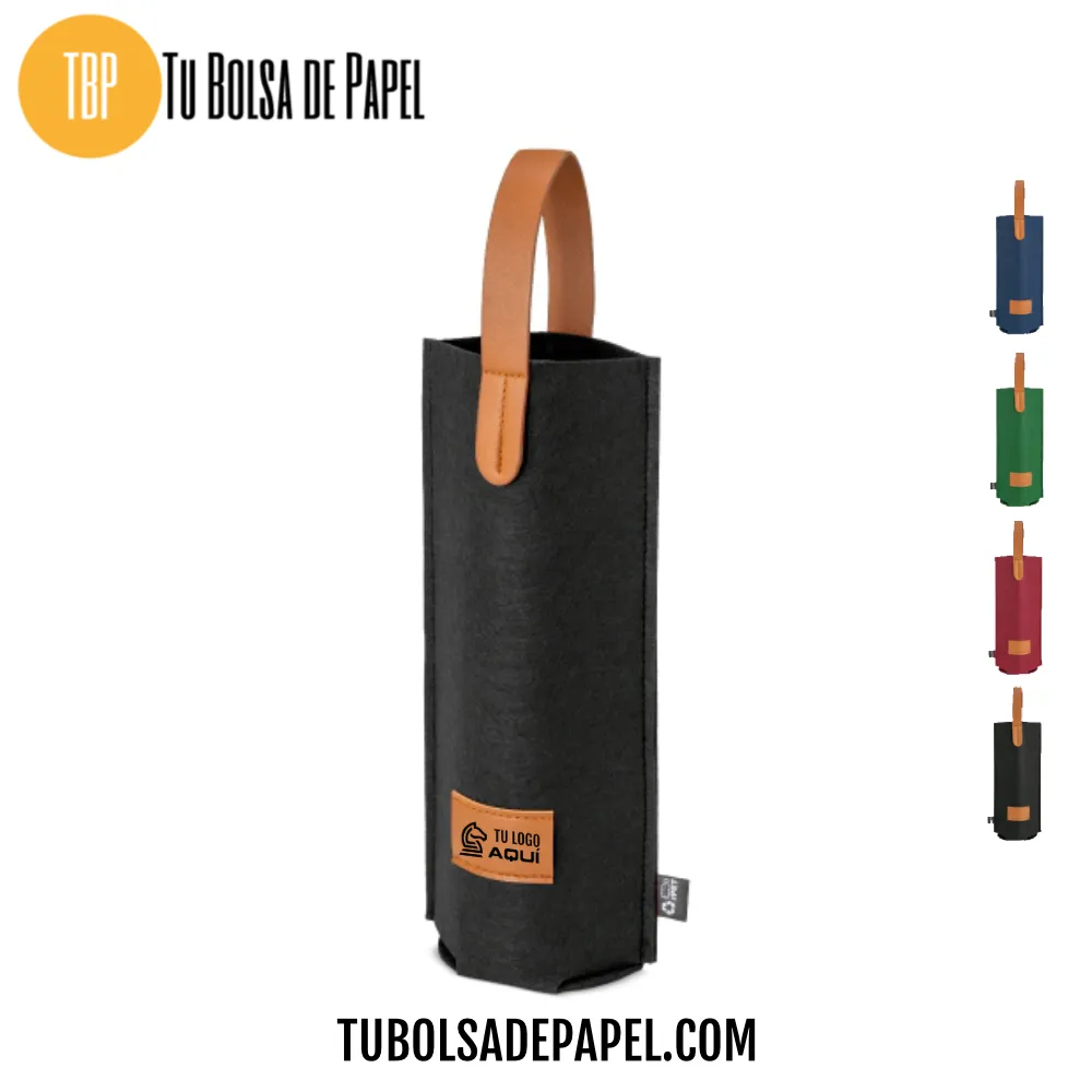 Da un toque sofisticado a tus obsequios con nuestra funda para botellas de vino en fieltro con asa y detalles en PU.