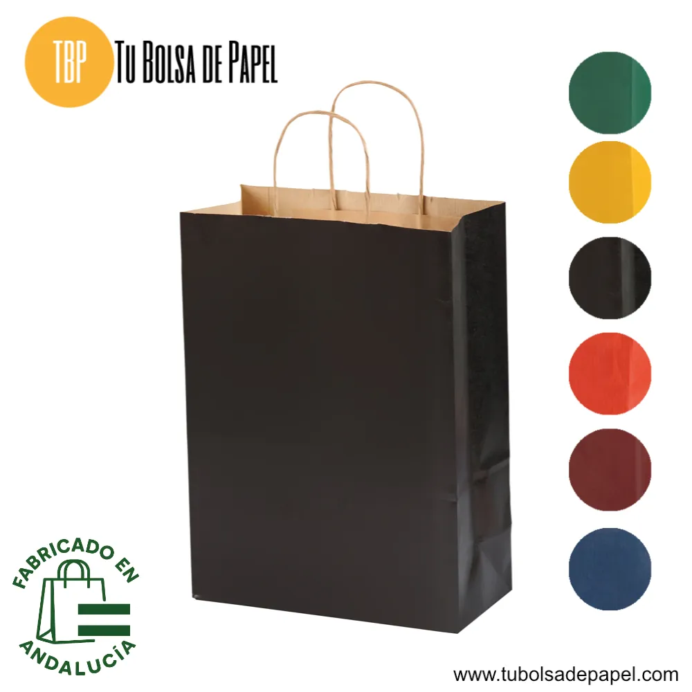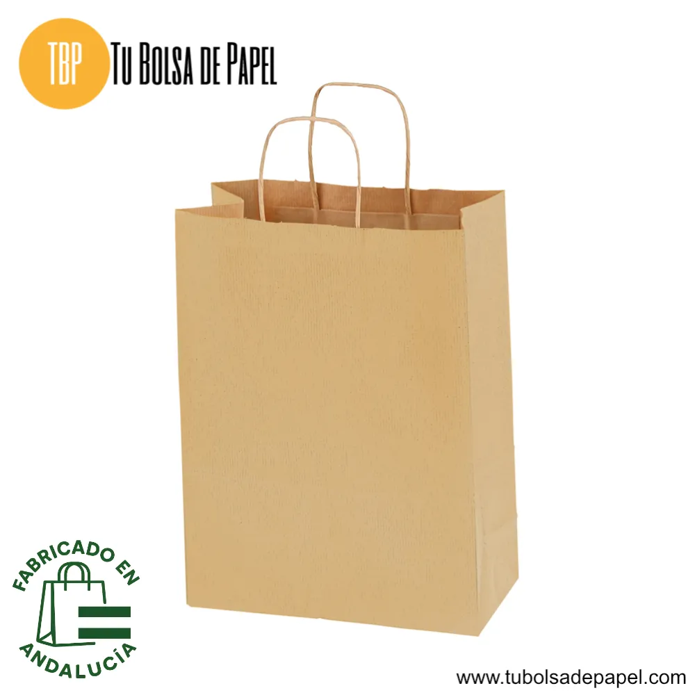 Las Bolsas de Papel Kraft con un tamaño óptimo para tu tienda, Farmacia, comercio o evento. Las bolsas de papel para tiendas y farmacias están realizadas en papel verjurado (kraf) de diferentes colores y con 100 gr. Se presentan con el asa retorcida, lo que le confiere mayor resistencia y comodidad al agarre.