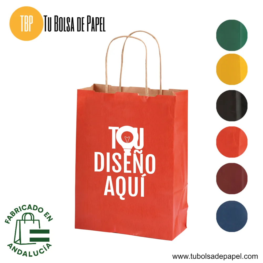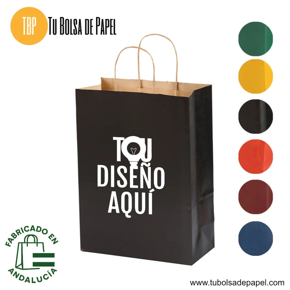 Las Bolsas de Papel Kraft impresas a una tinta por las dos caras con el logo de tu tienda, Farmacia, comercio o evento y toda la información de contacto (Teléfono, dirección, web, redes sociales, etc). Las bolsas de papel para tiendas y farmacias están realizadas en papel estucado (celulosa) de diferentes colores y con 100 gr. Se presentan con el asa retorcida, lo que le confiere mayor resistencia y comodidad al agarre.