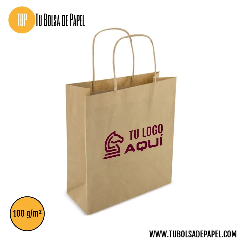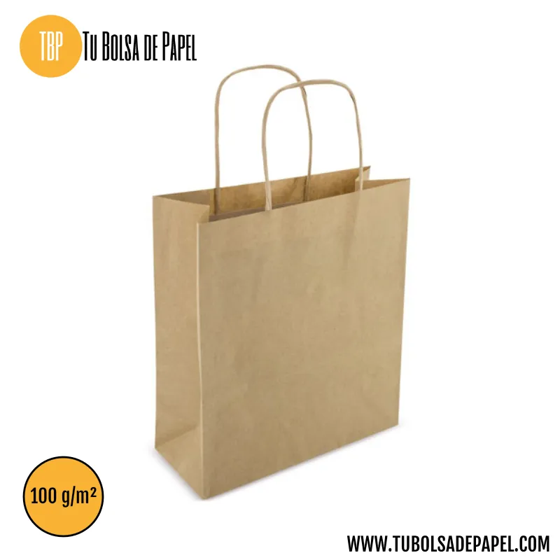 Con un peso total de 40 gr estas bolsas de papel están realizadas en papel kraft de 100 gr/m2 y están confeccionadas con unas asas cortas retorcidas con un refuerzo especial, lo que eleva hasta los 5 kg su resistencia.