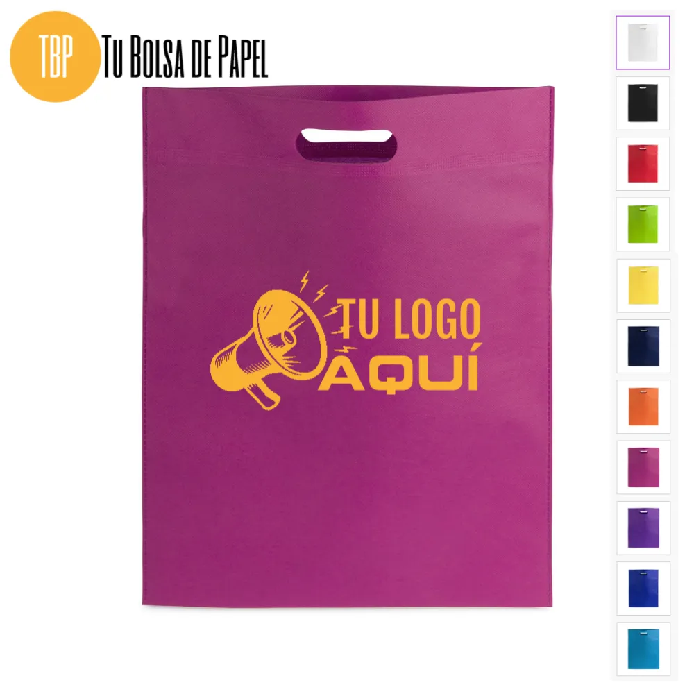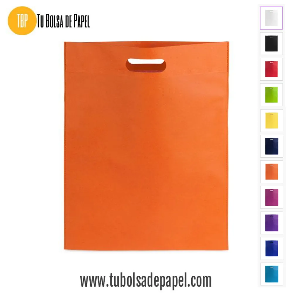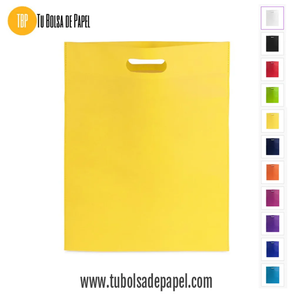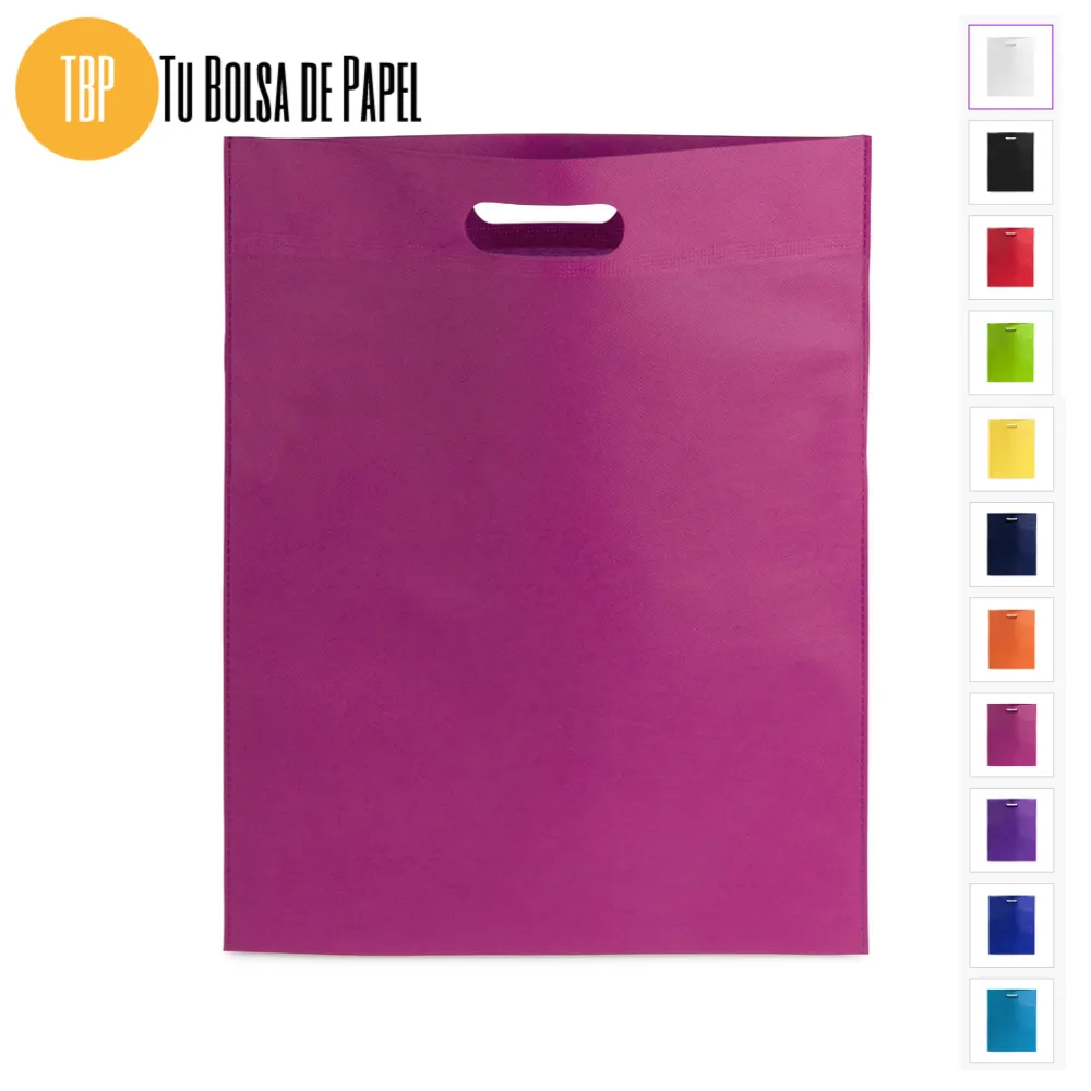 Bolsa realizada en non-woven de 80g/m2 disponibles en siete colores especialmente indicadas para complementos y prendas de vestir o documentación comercial y folletos en convenciones, congresos y ferias de muestras. Están confeccionadas con asa reforzada troquelada.