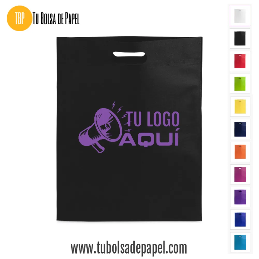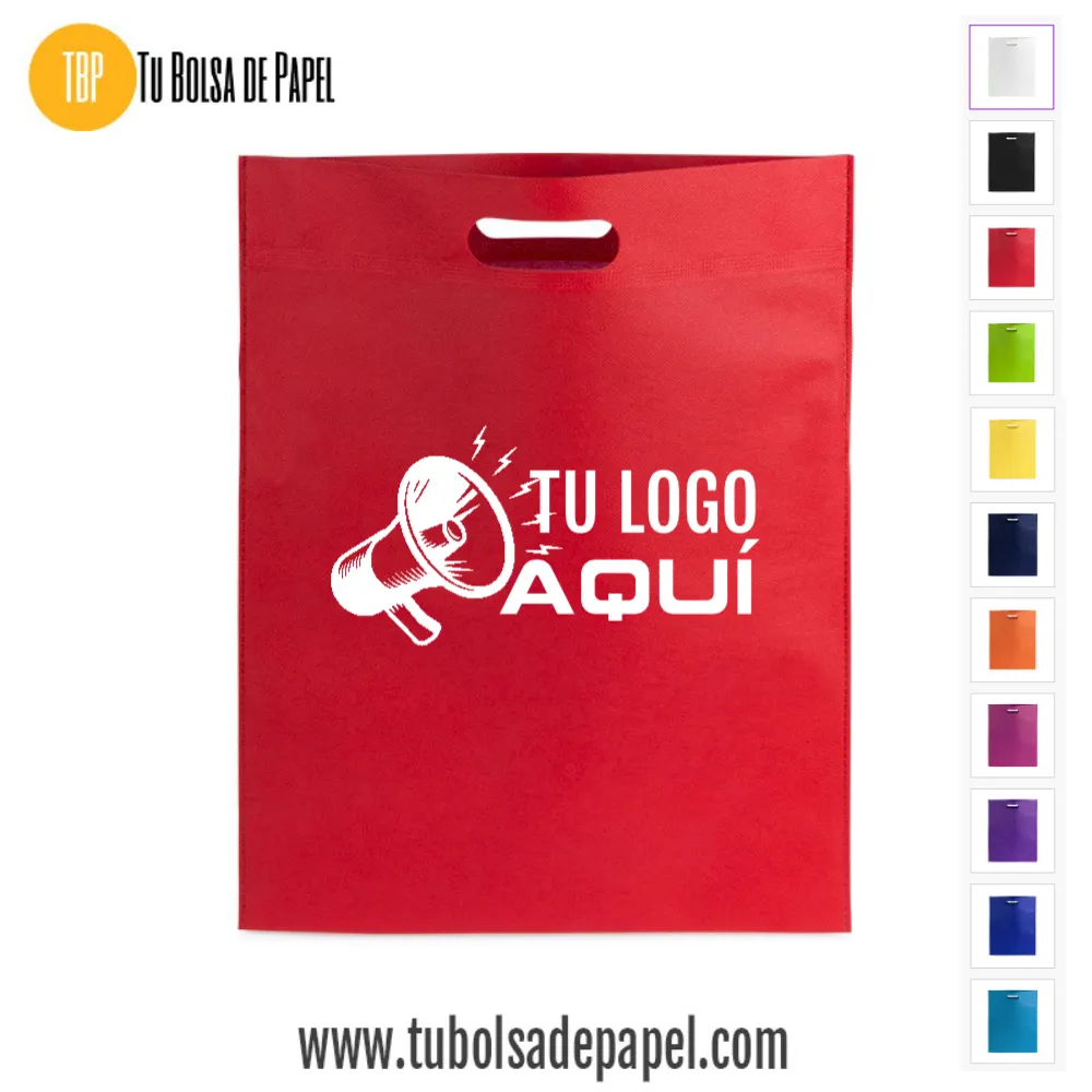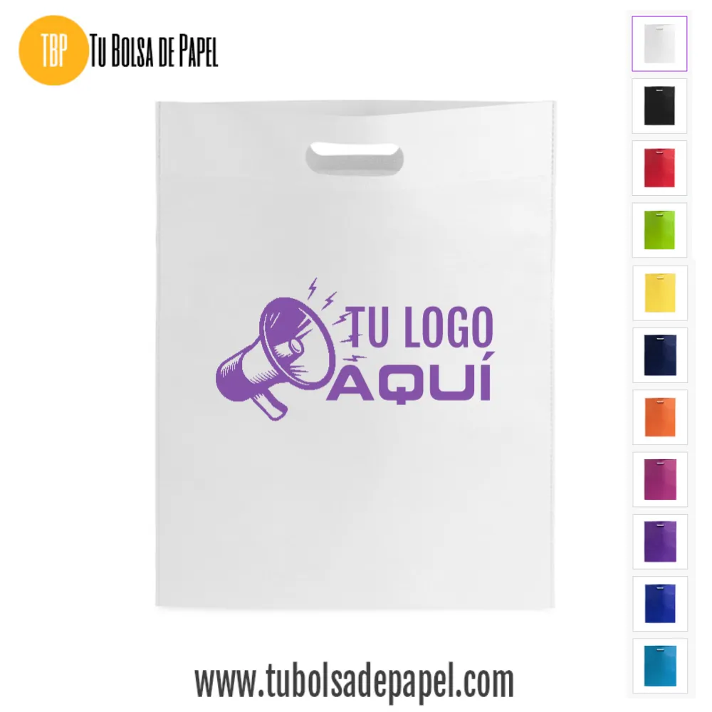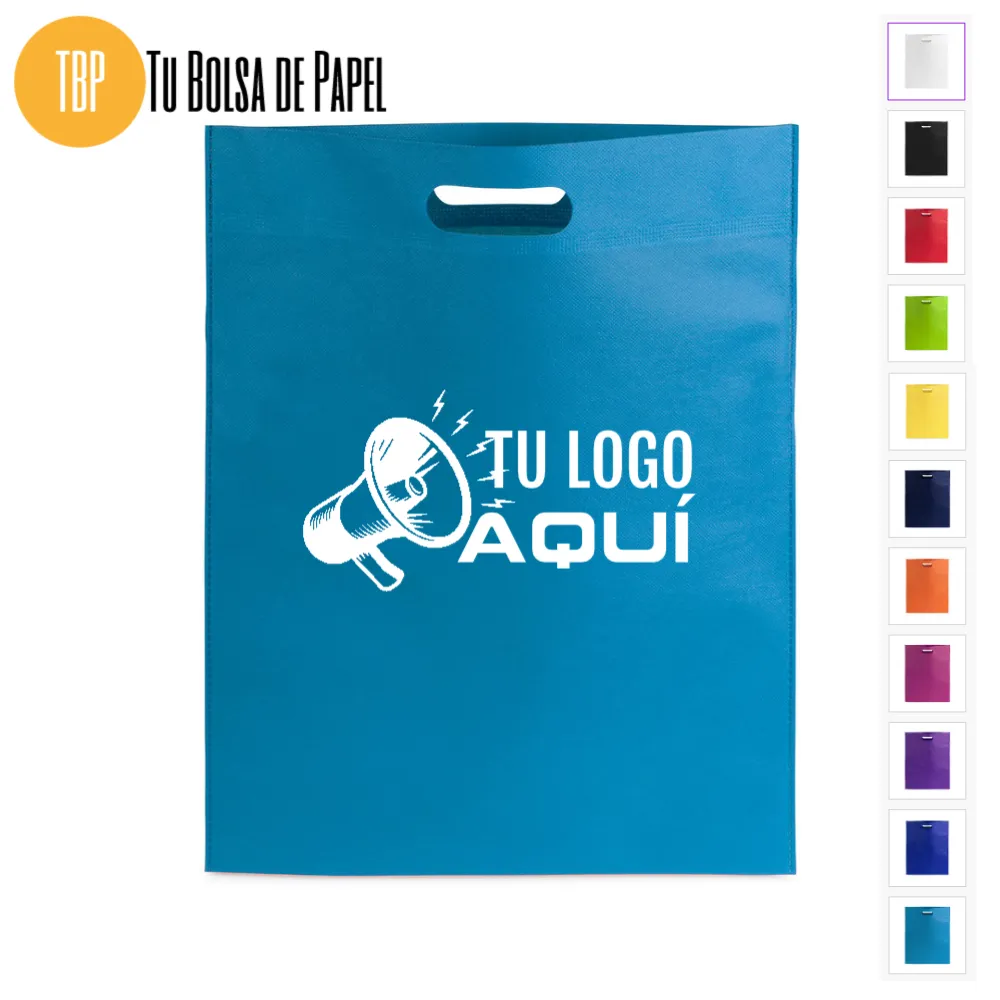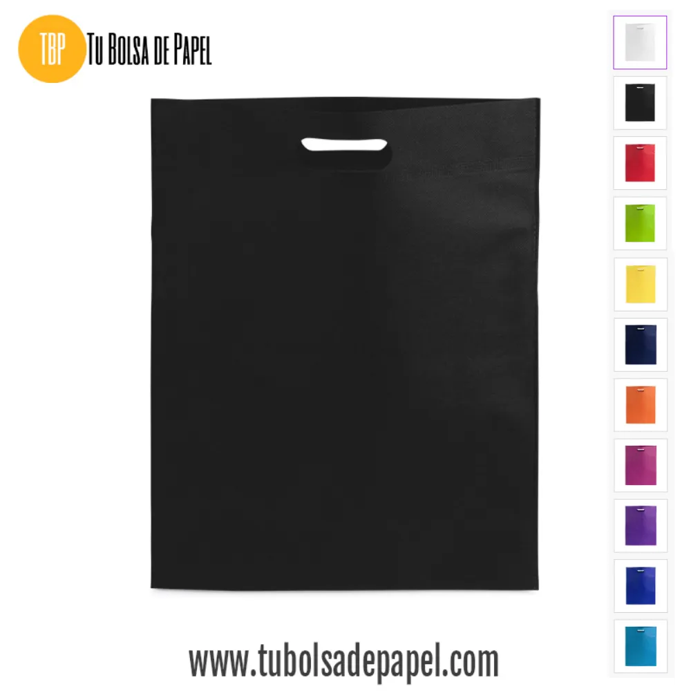 Bolsa realizada en non-woven de 80g/m2 disponibles en siete colores especialmente indicadas para complementos y prendas de vestir o documentación comercial y folletos en convenciones, congresos y ferias de muestras. Están confeccionadas con asa reforzada troquelada.