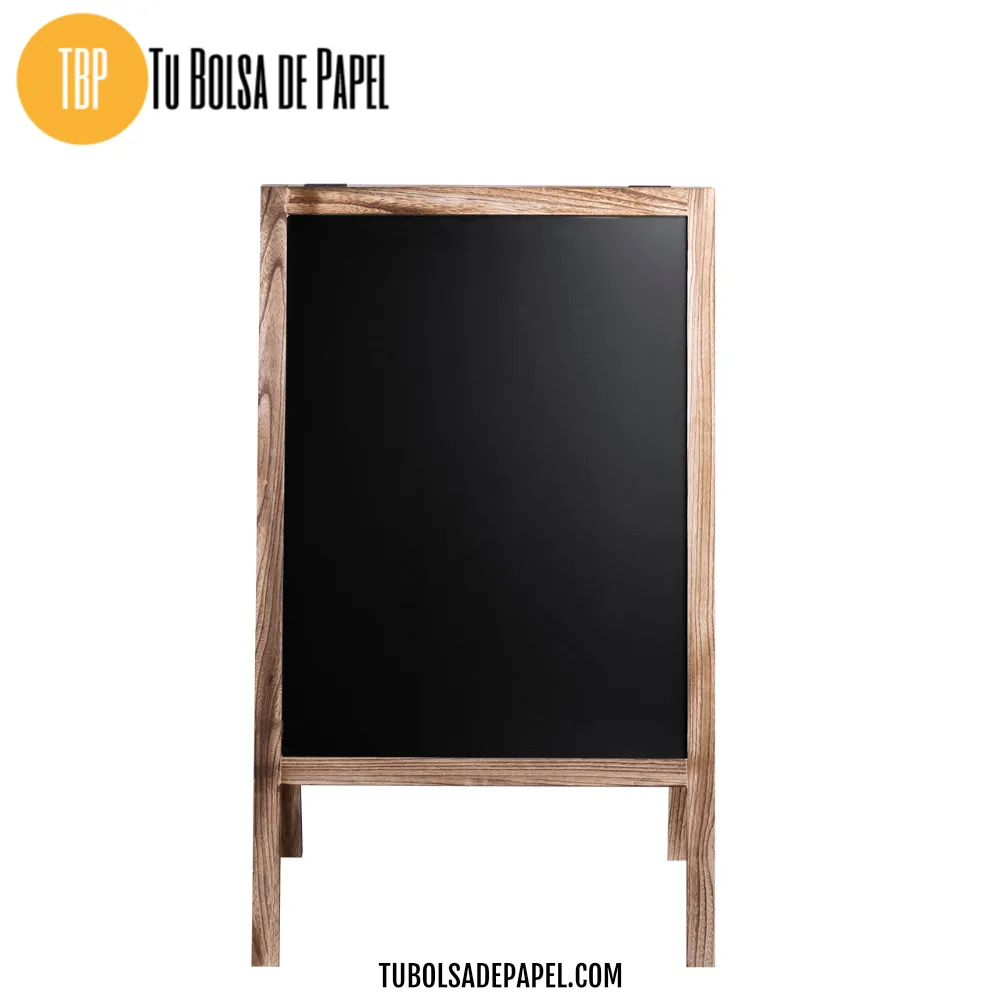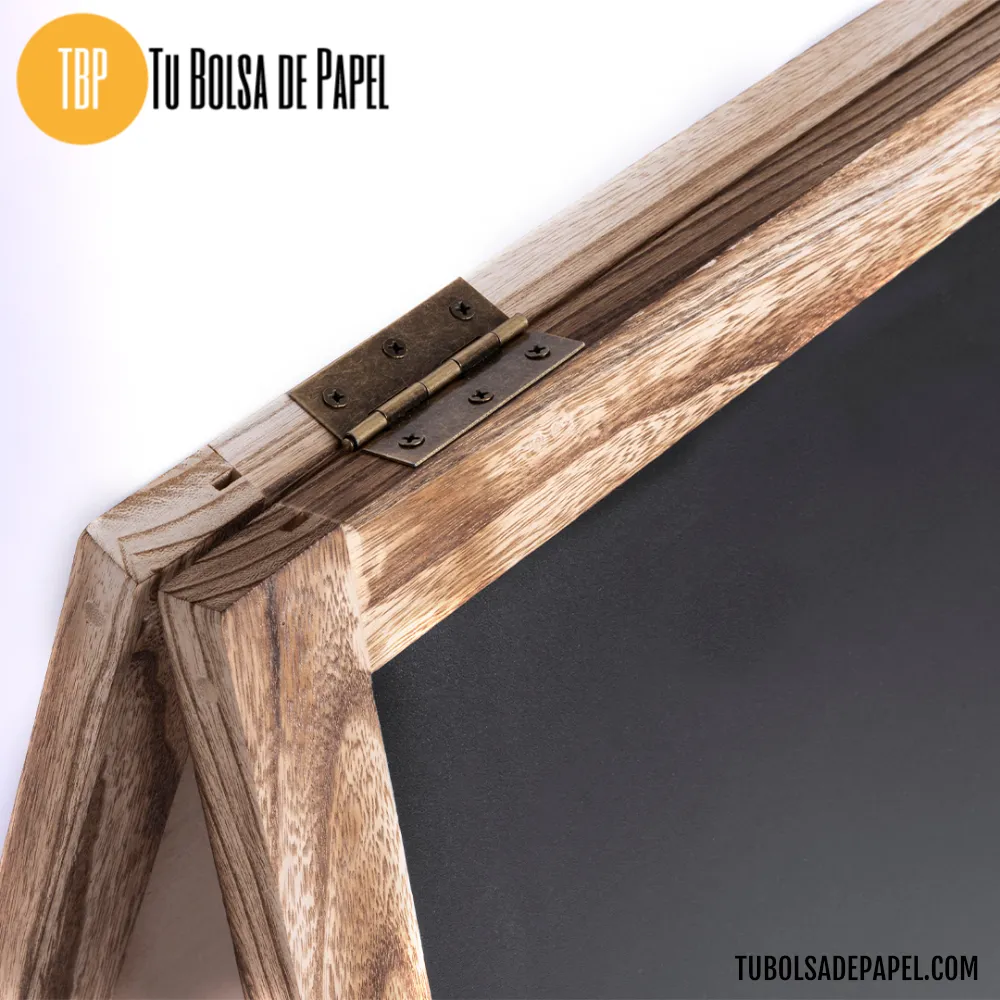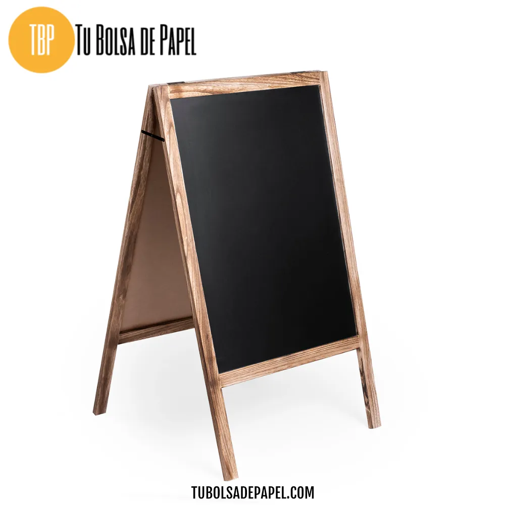 Fabricado en madera de alta calidad, cuenta con dos pizarras para escribir en ambas caras, lo que lo convierte en una herramienta práctica y muy visible, tanto para interior como para exterior.
