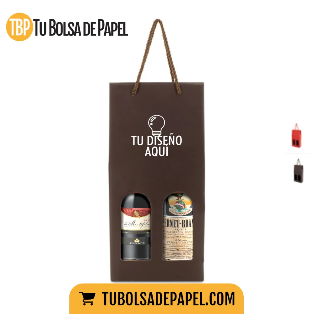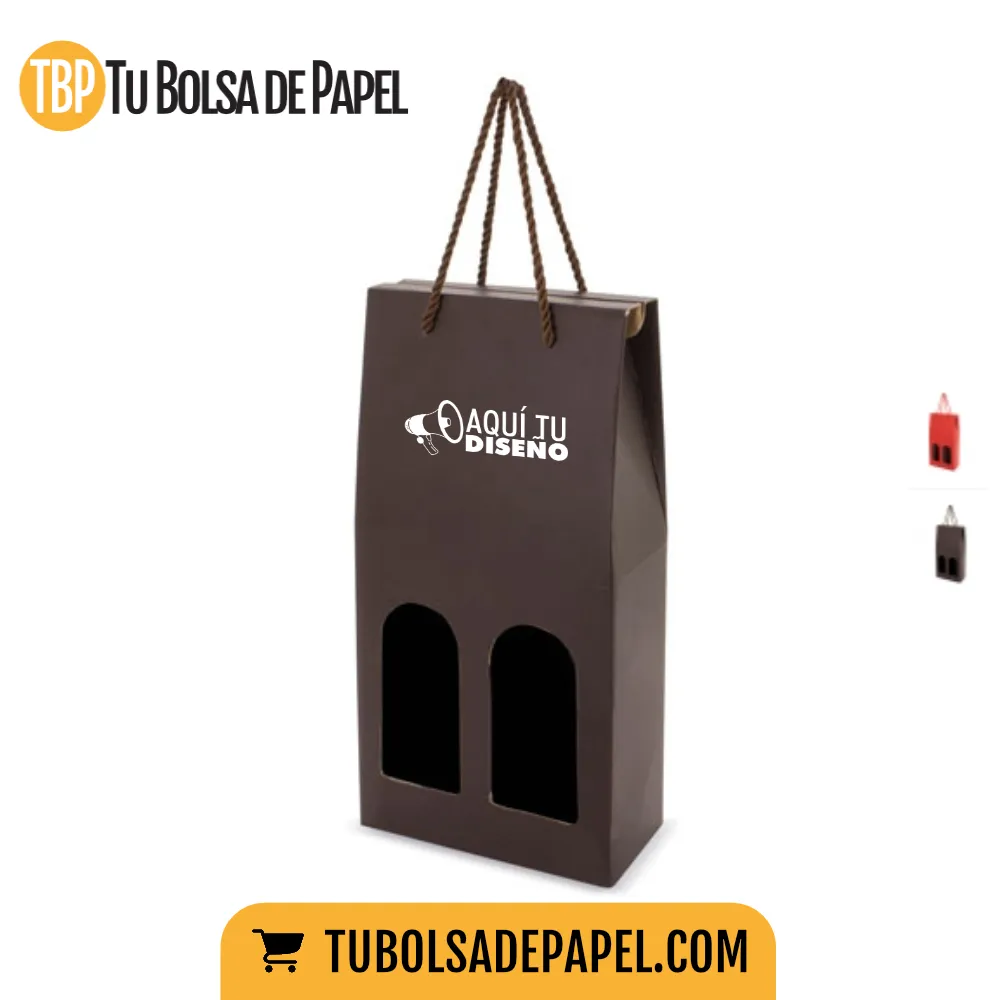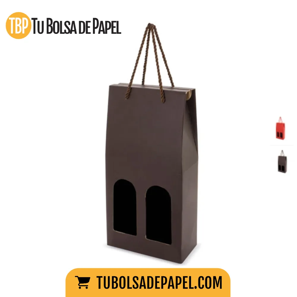 Fabricado en cartón reforzado, este envase ofrece la rigidez necesaria para soportar el peso de dos botellas estándar (vino, cava o licores) garantizando un transporte seguro gracias a su sólida asa de cordón.