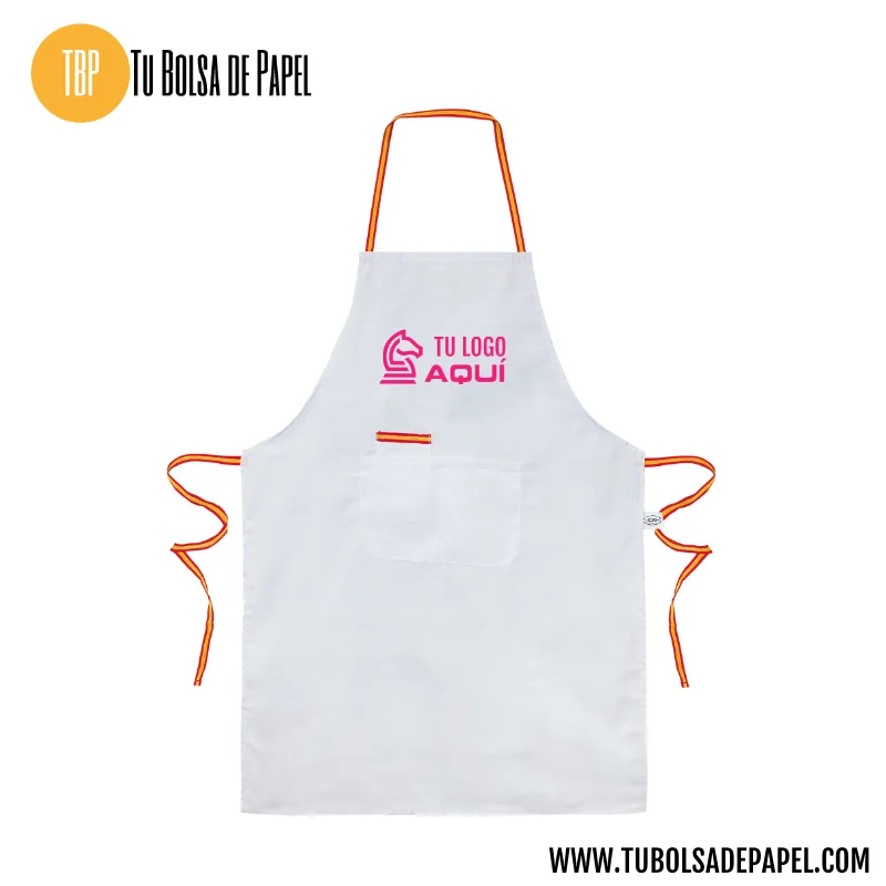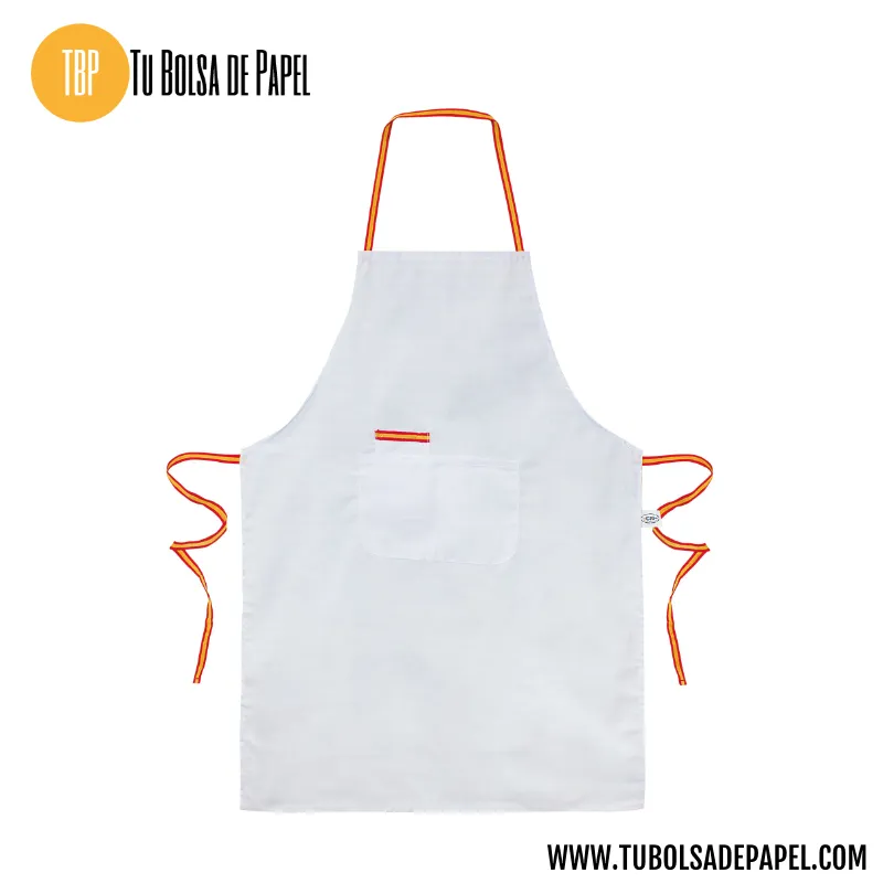Delantal en color blanco ideal para hostelería y restauración o Peluquerías y Barberías, decorado con los colores de la Bandera de España en los ribetes, realizado 100% en Algodón con suave acabado.