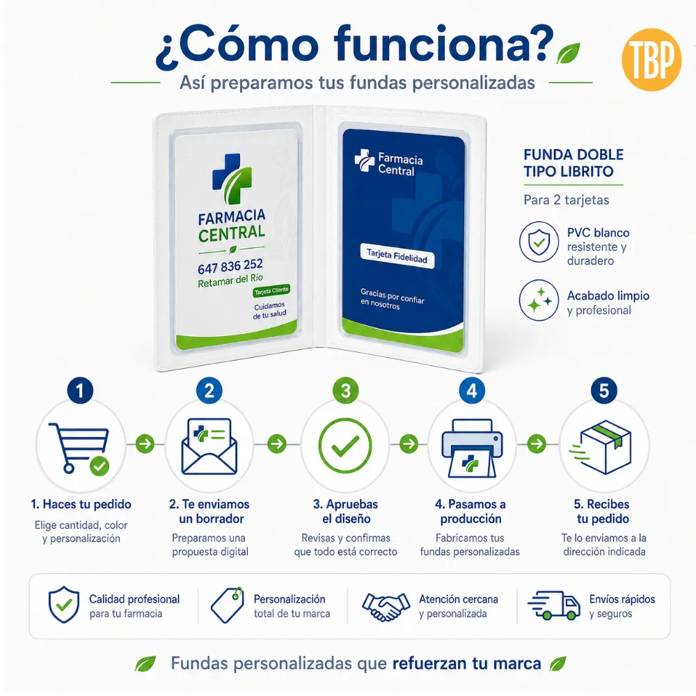 La funda doble es muy práctica para farmacias que trabajan con tarjetas de fidelización, tarjetas de seguimiento, servicios personalizados, SPD, campañas sanitarias, promociones locales o programas de atención al paciente.