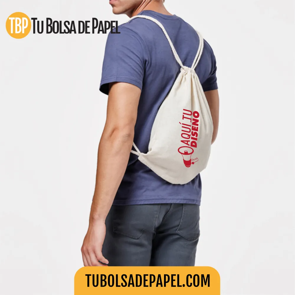 Mochila de cuerdas realizadas en algodón 100% de 140 grs. Excelente acabados con cuerdas de 8 mm, personalizadas con tu logotipo a una tinta o a todo color.