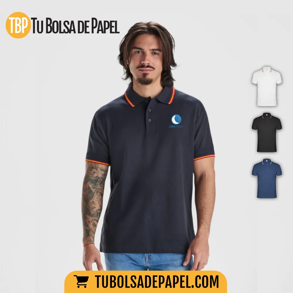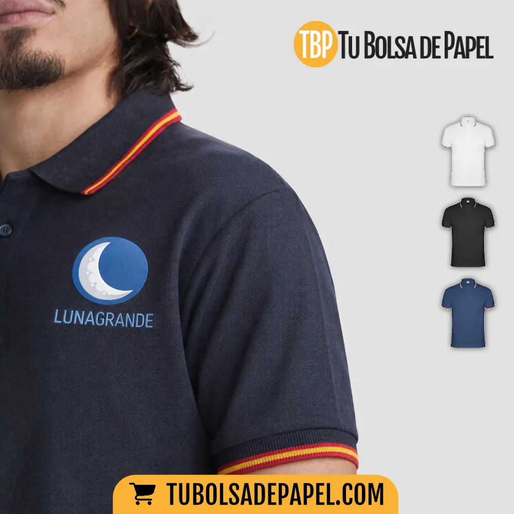 Puedes comprar este polo bandera de España para hombre sin personalizar o añadir bordado a todo color en tamaño escudo (50 x 50 mm).