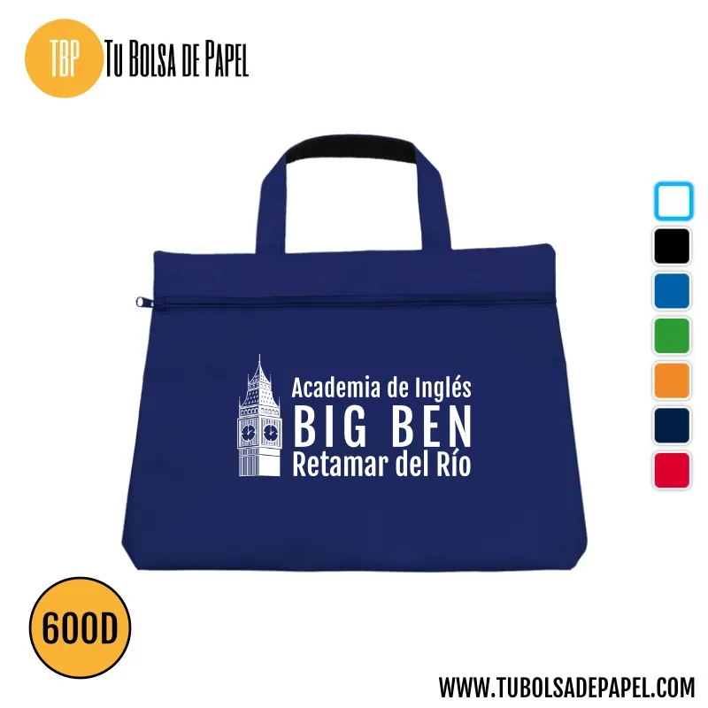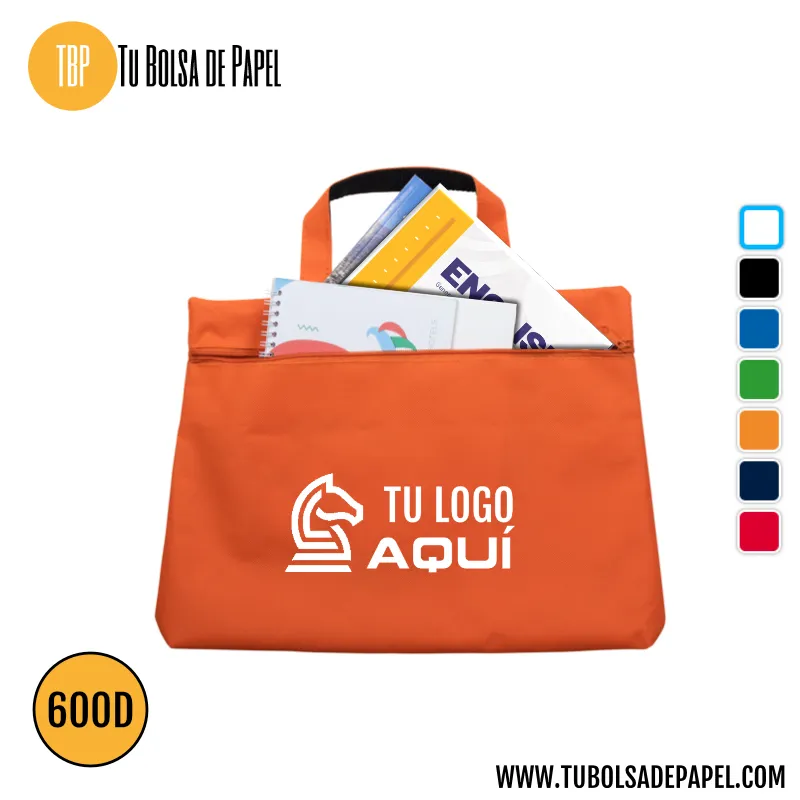 Este práctico portadocumentos con asa está fabricado en resistente poliéster 600D, ofreciendo una excelente durabilidad y protección para tus papeles, catálogos, cuadernos o carpetas. Su diseño compacto y funcional lo convierte en el compañero perfecto para ferias, congresos, formación, oficina o academias.